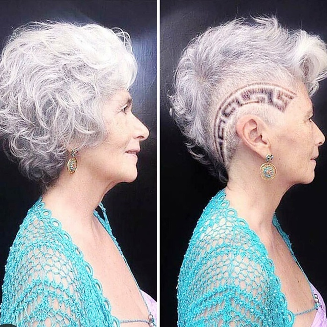 Mái tóc bạc được cắt sát 2 bên, vuốt cao giúp phụ nữ lớn tuổi trông trẻ trung và tràn đầy năng lượng. Ảnh: @behindthechair_com.